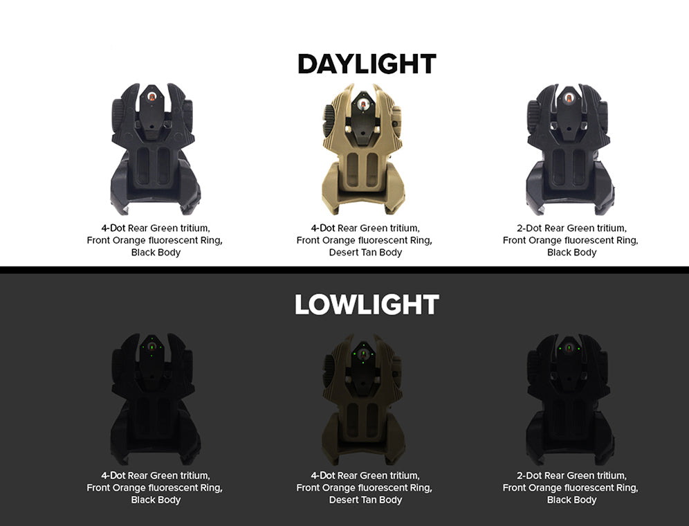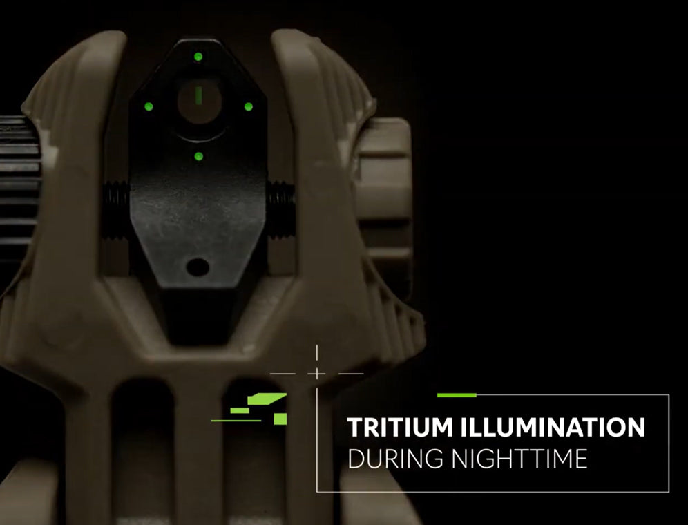 AINA PÄÄLLÄ: Ensiluokkaiset vihreät sveitsiläisvalmisteiset Tritium-pullot etu- ja takatähtäimissä mahdollistavat hämärässä ja yöolosuhteissa. Ei paristoja, ei kytkimiä – aina päällä aina valmiina 24/7 12 vuoden ajan. Yövalaistus on suunniteltu riittävän kirkkaaksi näkemään ne, mutta ei liian kirkas vaikuttamaan näkökuvaan.